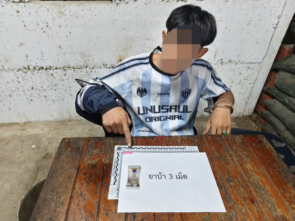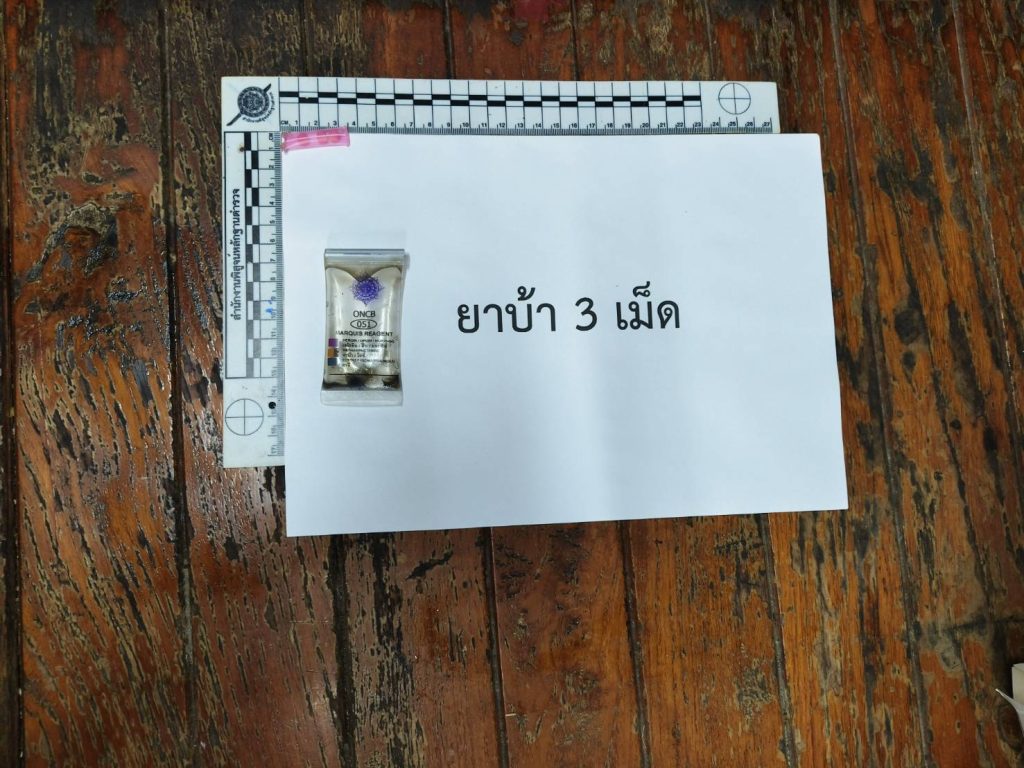 ยาเสพติดให้โทษประเภท ๑ (ยาบ้าหรือเมทแอมเฟตามีน)ชนิดกลมแบนสีแดง ประทับด้วยอักษร WY ด้านหนึ่ง จำนวน 3 เม็ด