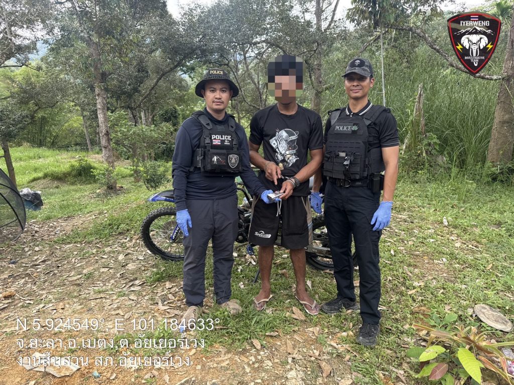 สถานที่ตรวจค้น/จับกุม บริเวณข้างบ้านเลขที่ ม.2 (บ้านตันหยงกาเม็ง) ต.อัยเยอร์เวง อ.เบตง จ.ยะลา