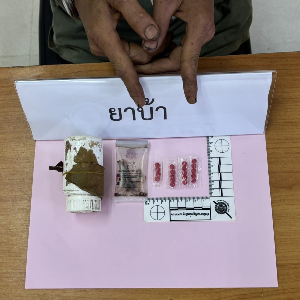 2.ยาเสพติดให้โทษประเภท ๑ (ยาบ้าหรือเมทแอมเฟตามีน) ชนิดเม็ดกลมแบนสีแดงประทับด้วยตัวอักษร WY ด้านหนึ่ง อีกด้านหนึ่งผิวเรียบ จำนวน 4 เม็ด บรรจุอยู่ในถุงพลาสติกใสปิดหัวท้ายด้วยความร้อน น้ำหนักรวมถุงบรรจุประมาณ 1.95 กรัม รวมของกลางยาบ้าทั้งหมด จำนวน 19 เม็ด